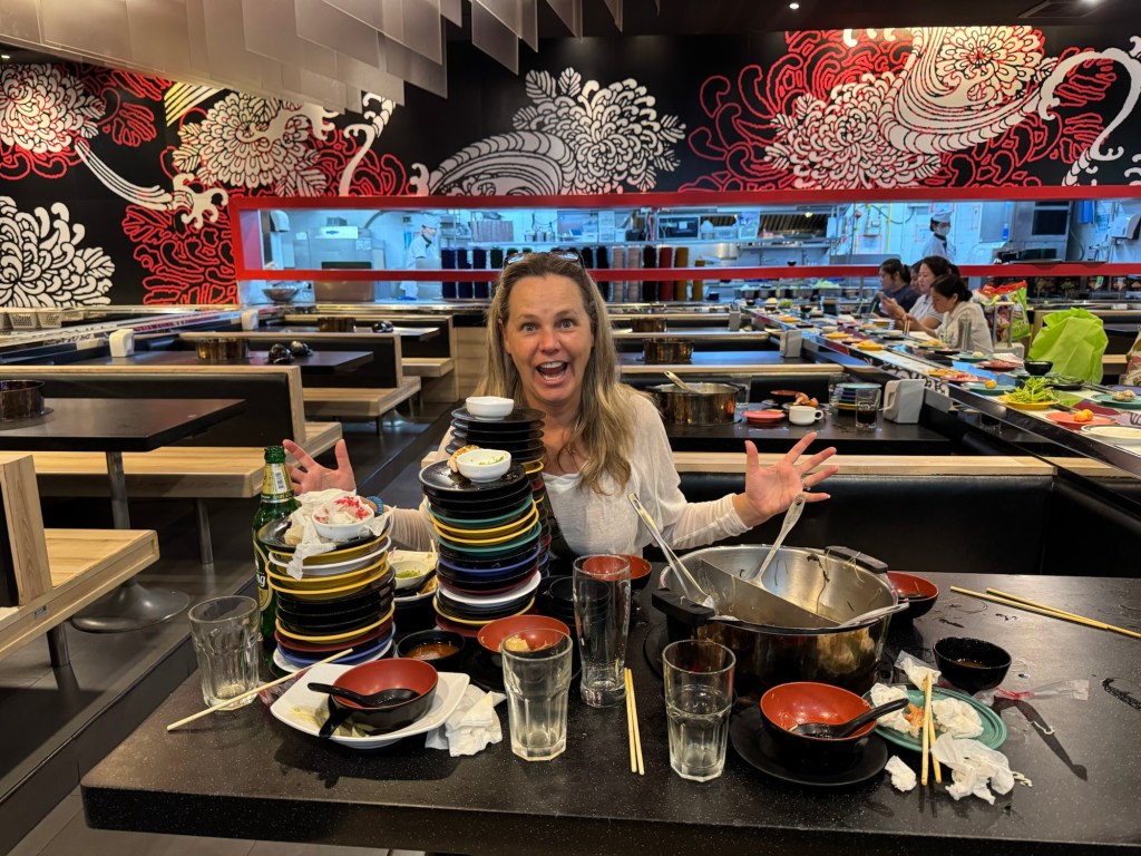 Our hotel is connected to a four-story mall, and that’s where we had dinner. Since we’re in Thailand, my friends—naturally—chose a Japanese conveyor belt hot pot restaurant. (Rolls eyes.) Plates of ingredients passed by on a belt, giving every diner a chance to breathe on them before they reached our table. At least everything was boiled before we ate it.