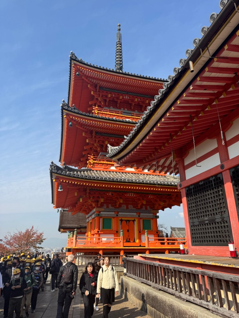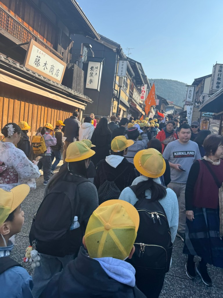 At our next stop, Kiyomizudera, we were met by dozens of tour buses and what felt like endless school groups. The streets were packed with children in their adorable yellow hats, mixed in with crowds of tour groups.