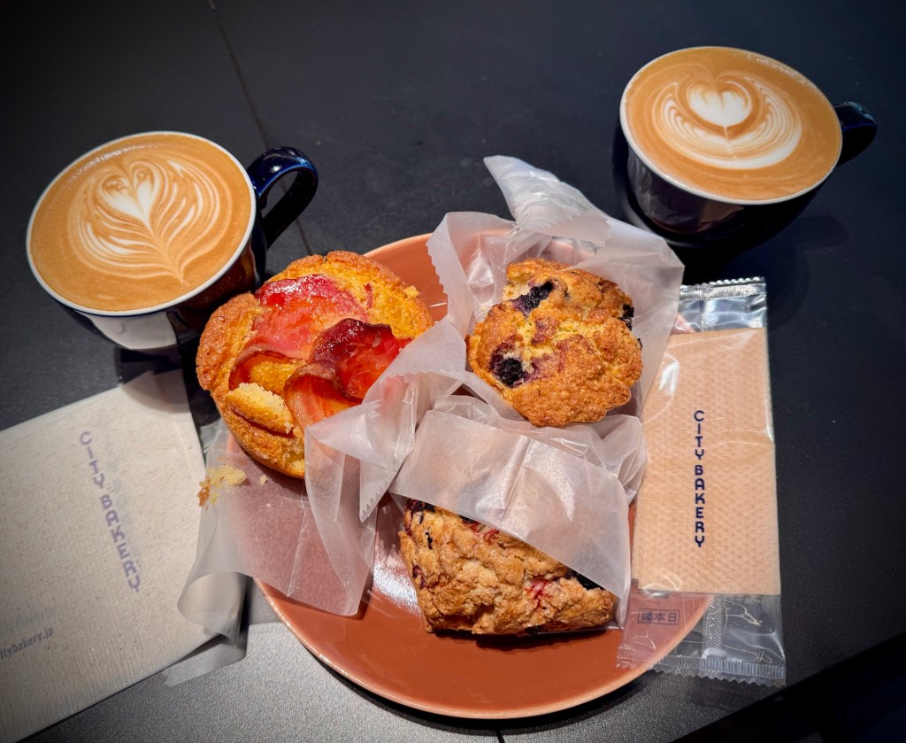 Lattes, bacon, and egg muffin (Jim), blueberry cornbread muffin (Me), and we shared a berry scone.